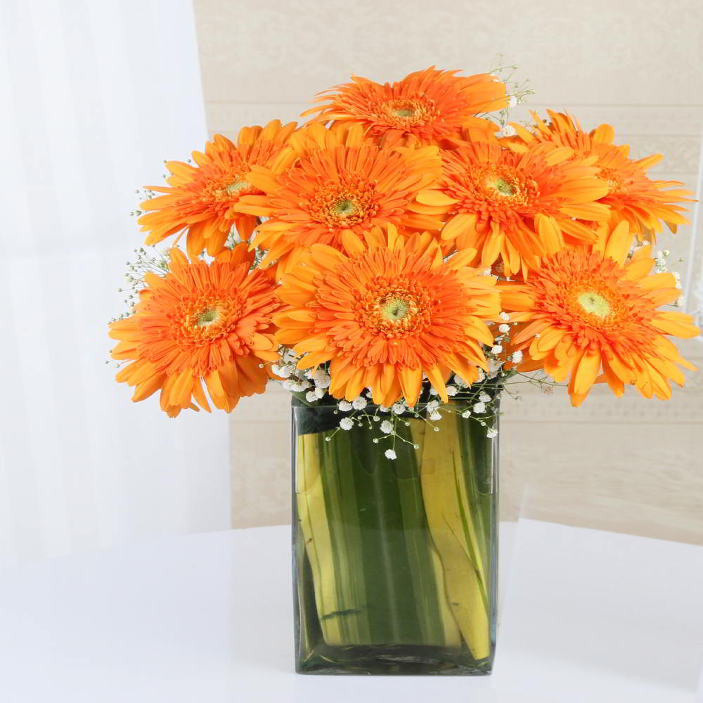 Carefully hand picked and artfully arranged, this is a mesmerizing arrangement of gerberas in a lovely glass vase that is all set to make a statement when gifted on special occasions of loved ones. Gerberas are in stunning orange shade and are accompanied by alluring fillers to add to its beauty. This incredible gift surely stands out making your dear ones feel special. You can order it online on special events like house warming, wedding anniversary, birthday and so on. So get going and book your order now to show them how much you care. For more info, go to Glass Vase Arrangement of 8 Orange Gerberas with Some Fillers.