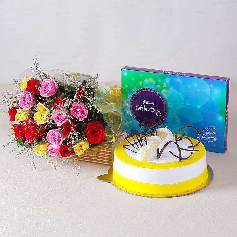 If you wish to surprise your loved ones with the awesomeness of your gift we have great options for you. This amazing gift combo includes this is a radiant bunch of twenty multi-color roses It is a clubbed Cadbury celebration chocolate box along with a lip-smacking half kg pineapple cake that takes its elegance to a new high. Gift this heartwarming gift combo to your loved ones on special occasions like Birthday Anniversaries Baisakhi Dhanteras Womens Day and makes it a grand celebration to cherish forever. Send this bountiful hamper along with other Gifts to India through Flowersacrossindia and make your recipient feel special.