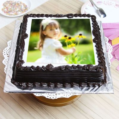Product Includes: 1 kg Square Shape Eggless Chocolate Flavor Personalized Photo Cake.