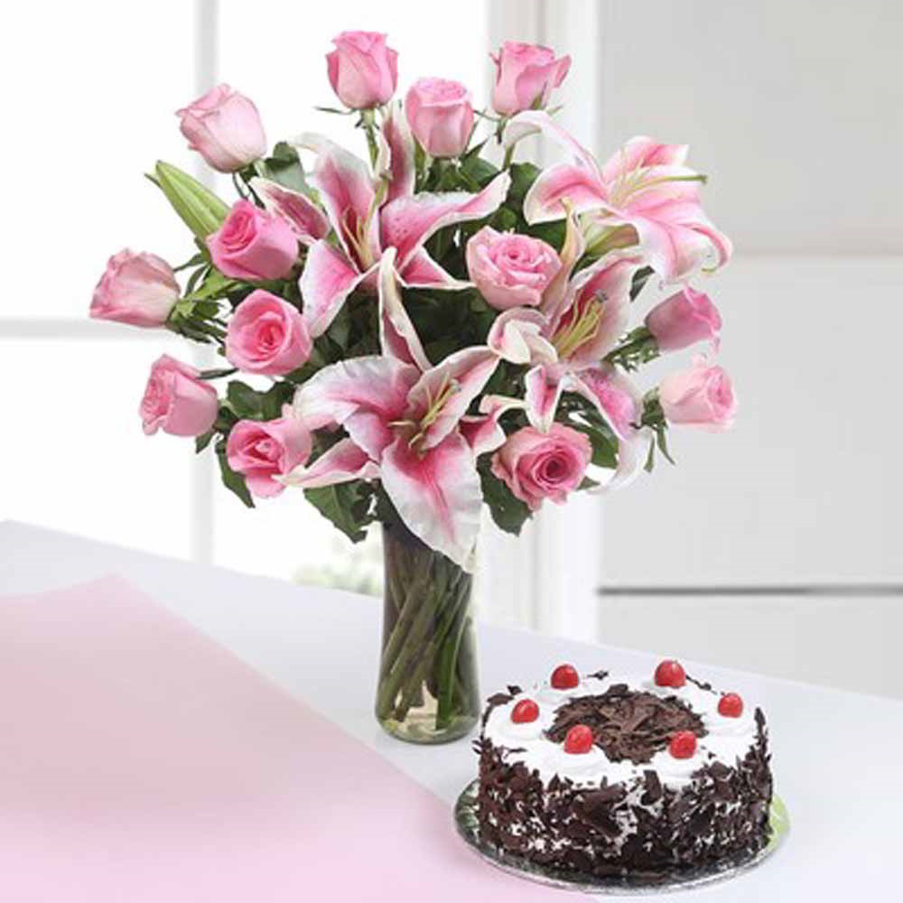 Exotic Pink Flowers Vase with Black Forest Cake