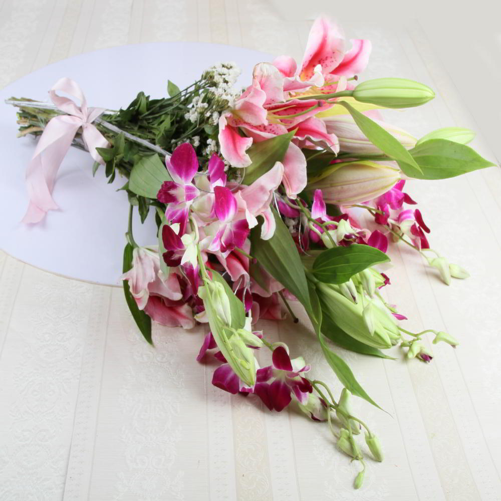 Product Includes: Bouquet of 10 flowers like Lilies and Orchids with some fillers.