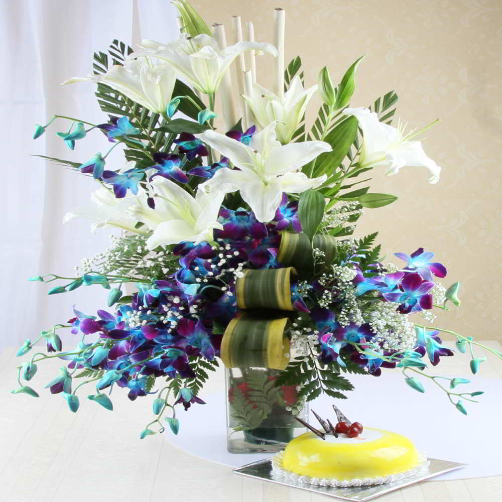 A glass vase of 15 Exotic Flowers like Orchids and Lilies with some fillers