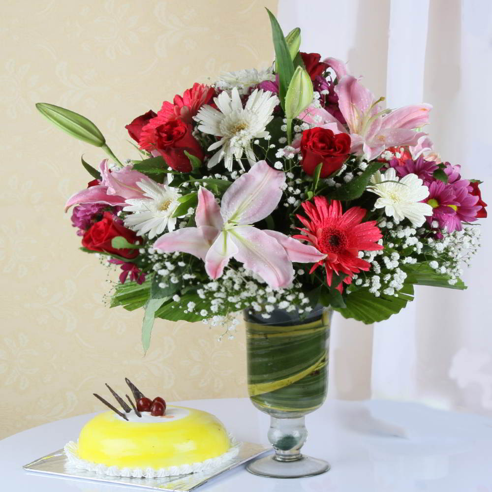 Sweeten your bond with your loved ones by gifting them this combo of Flowers, Cake. Let their special day be full of surprises. Perfect for all occasions like Birthday, Anniversary and many more. Your recipient will celebrate the party where ever he/she wants it is very unique for gifting. Bring a big long-lasting smile on their face don't let this opportunity go waste. Get this gift delivery easily by online through flowersacrossindia.com.