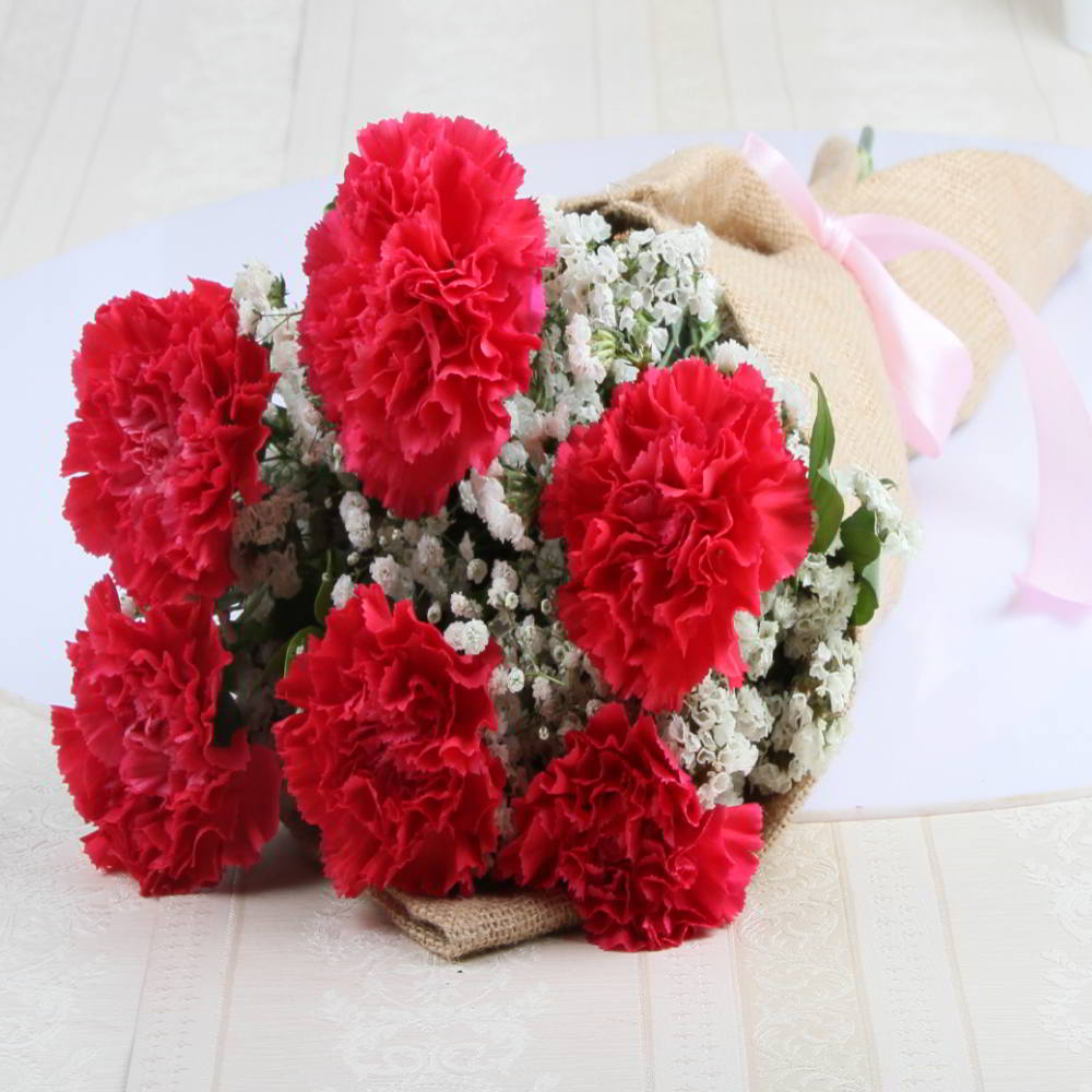 Nice bouquet arranged with red carnations, combined with delicate white baby's breath and complemented with jute by a wispy pink bow. Six delicate blooms and rich greens combine expertly to convey your best wishes to yours love one in India. Send these alluring flowers to India through flowersacrossindia.com and make your recipient feel extra special.