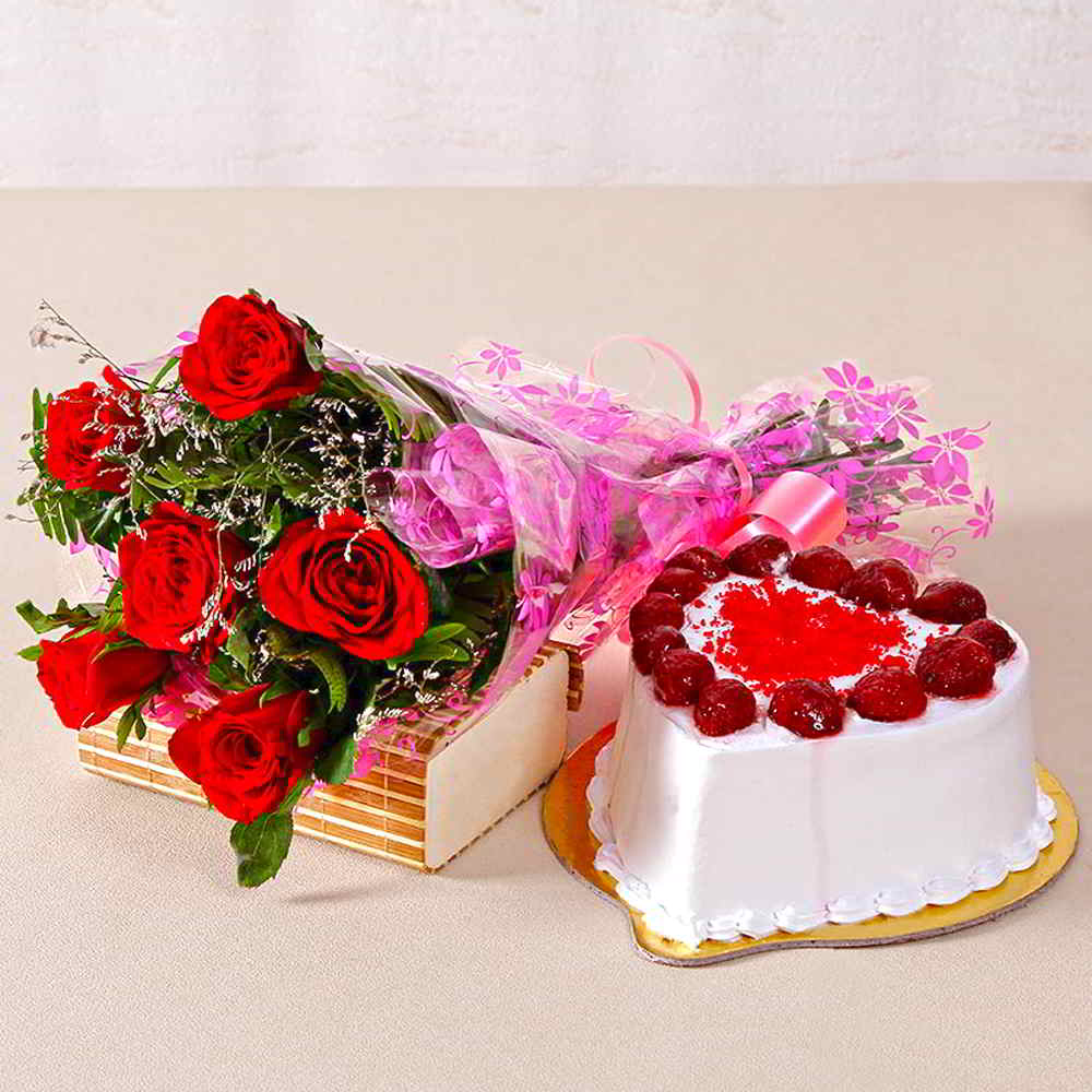 Beautiful red roses are radiantly clustered together in a crisp cellophane packing with a ribbon bow on it very artistically arranged by our expert florist. Combined with a delicious strawberry cake this gift item from Flowersacrossindia is ideal to send to your dear ones. The sweet-smelling six red roses along with the heart shape strawberry cake are sure to bring a warm smile to your special one`s face sure. You will not miss out on sending this gift hamper on special occasions like Birthday Anniversaries Retirement Gifts Easter Valentine's Day this is suitable for all occasions. You can also send this gift hamper along with other Gifts to India through flowersacrossindia.com