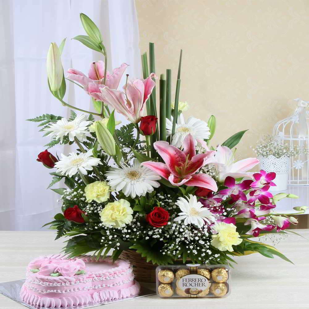 Comer closer and step ahead, make a mark in their heart send a gift combo to India with our Same Day delivery services Fill the heart of your dear ones with love and joy with this wonderful hamper containing Flowers, Chocolate, and Cake. This gift hamper says, Thank you for being a good friend in my life this would surely increase the sweet emotions in your life. Hurry up carry the charm and sweetness of a friendship or of a new love. Get this lovely gift delivery online through flowersacrossindia.com.