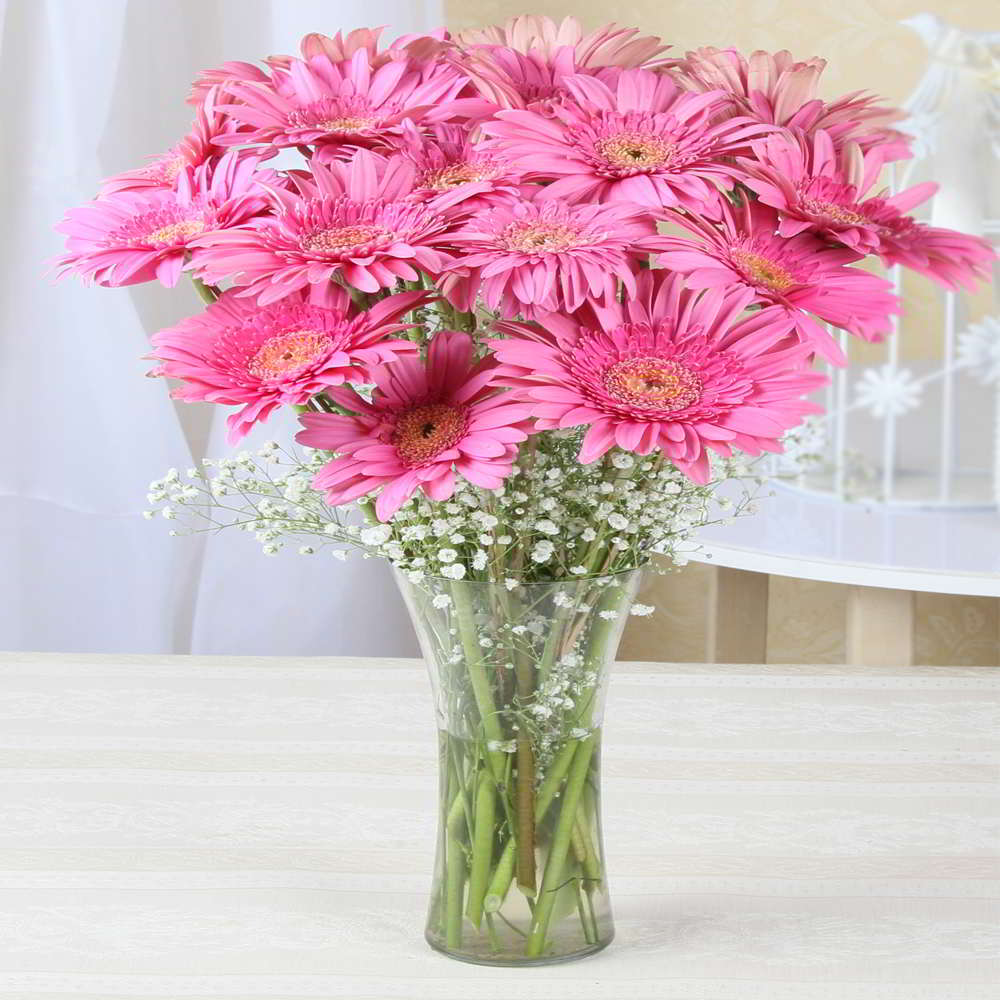 You will definitely adore these charming and cute pink gerberas that come neatly placed in a glass vase for company. Gifting flowers to anyone is a great thing as flowers have the capacity to make anyone delighted from the core. It looks more than amazing and will definitely be liked by anyone gifted this with. Gerberas are definitely some of the best gifts ever when it comes to celebrating and commemorating special occasions. It contains a vase of lovely gerberas. These gerberas will soothe your soul and eyes alike and have been wonderfully packed. So place an order for it and we will deliver this straight to the doorsteps of your dear ones. This arrangement makes for a pure, cute and charming gift for occasions like Birthday, Anniversary, Sorry, Onam, Parents Day, Missing You, Ganesh Chaturthi, Boss Day etc. These flowers are nicely wrapped in for added quality and elegance alike. Product Includes: Glass vase arrangement of 20 Pink Gerberas with some filler.